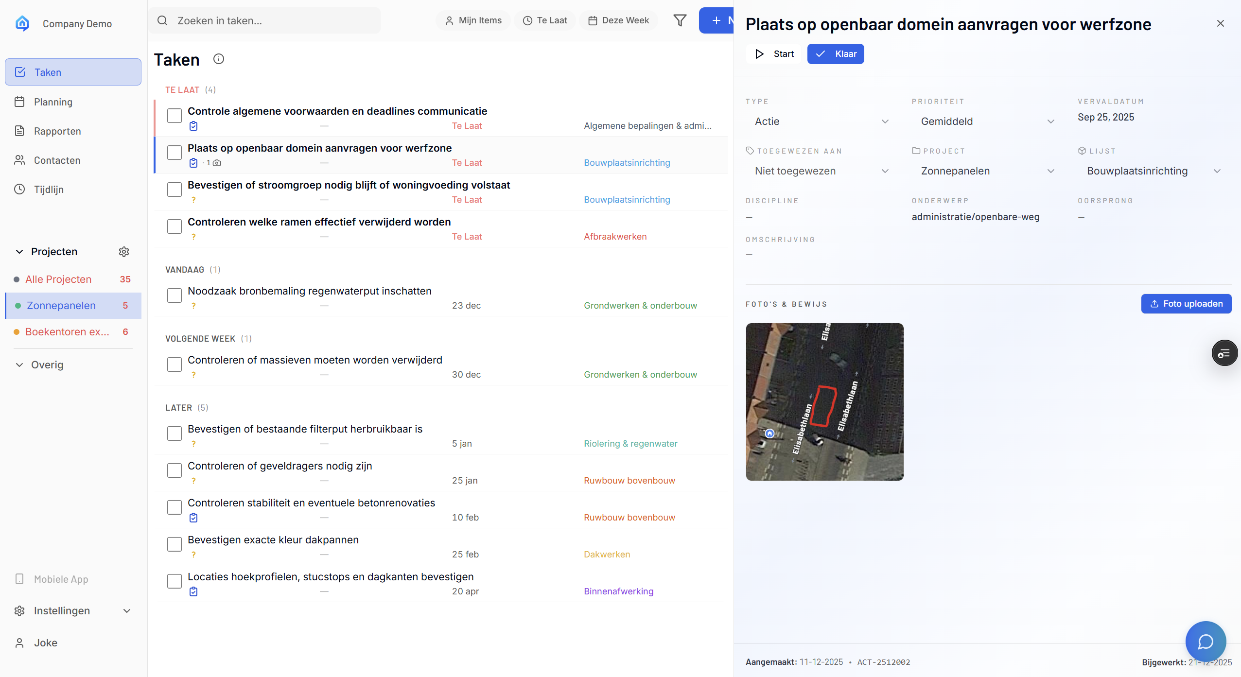 Maak foto's van problemen of meerwerk. Markeer de exacte locatie op een plattegrond. Alle bewijsstukken worden direct aan het item gekoppeld.